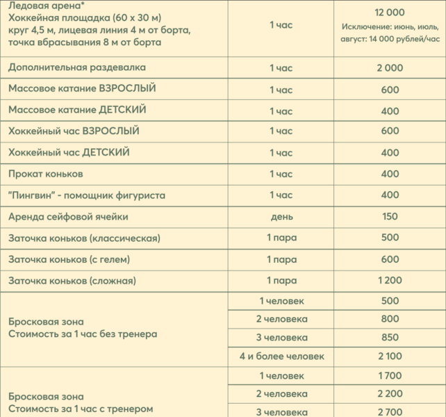 Работает школа с профессиональными тренерами для юных хоккеистов и фигуристов. Проводятся индивидуальные и групповые тренировки по хоккею и фигурному катанию.